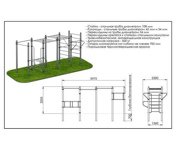 • Перекладины из трубы диаметром 34 мм, толщина стенки 3 мм, крепятся к стойкам стальными хомутами