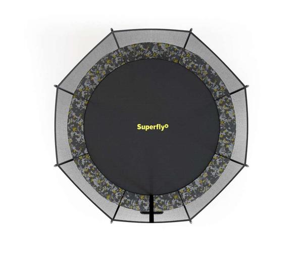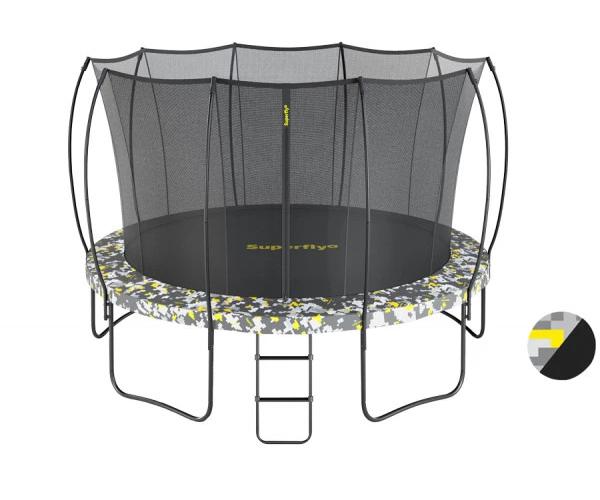 Серия Superfly имеет двухсторонний защитный мат, то есть вы можете переворачивать мат и менять дизайн батута. В комплекте два цветовых решения: это Digital Como — он же цифровой камуфляж и Black classic или просто классический черный.