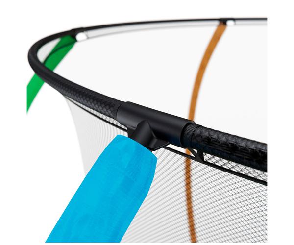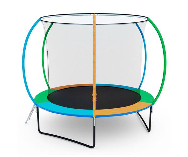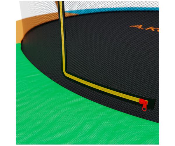 Внутренняя защитная сетка высотой 185 см обеспечивает безопасность пользователей, предотвращая возможные выпады за пределы батута. Она легко открывается и закрывается с помощью специального замка и надежно фиксируется на стойках, выполненных из высокопрочной стали.