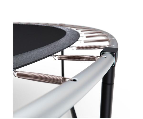 Основная рама батута состоит из 8-ми прочных стальных труб диаметром 38 мм и толщиной 1,2 мм, что обеспечивает устойчивость и безопасность при использовании. U-образные ножки и стойки для защитной сетки также выполнены из высокопрочной стальной трубы.