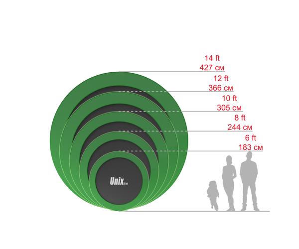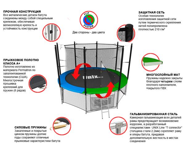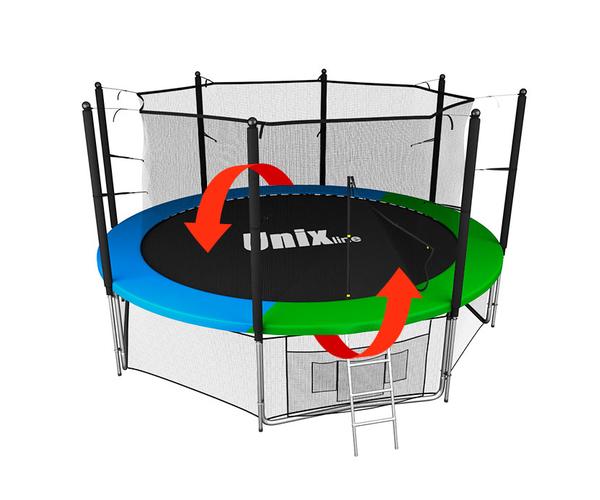 Помимо верхней защитной сетки, все батуты модельного ряда UNIX line оборудованы нижней защитной сеткой, которая препятствует проникновению под прыжковое полотно батута детей, животных, а так же попаданию посторонних предметов, и лестницей для удобства пользования. А в моделях диаметром от 10FT (305см.), в комплект входят специальные крепления батута к земле (колышки).
