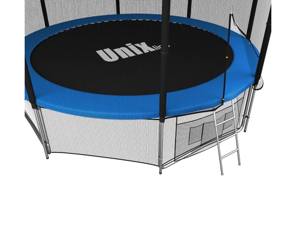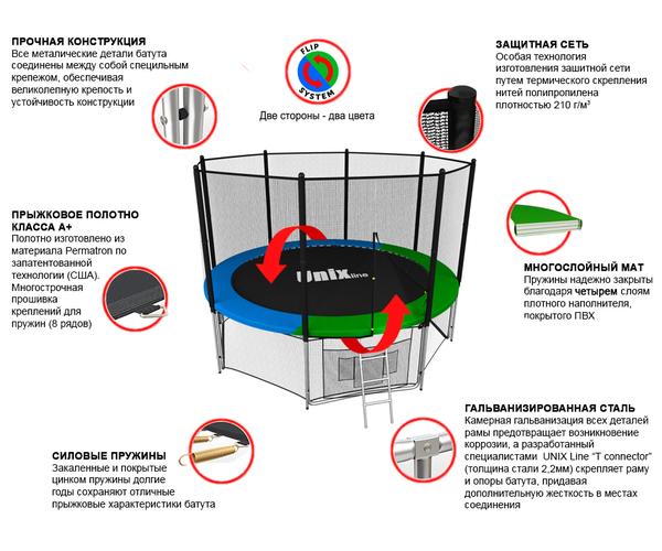 Помимо верхней защитной сетки, все батуты модельного ряда UNIX line оборудованы нижней защитной сеткой, которая препятствует проникновению под прыжковое полотно батута детей, животных, а так же попаданию посторонних предметов, и лестницей для удобства пользования. А в моделях диаметром от 10FT (305см.), в комплект входят специальные крепления батута к земле (колышки).