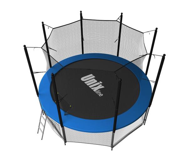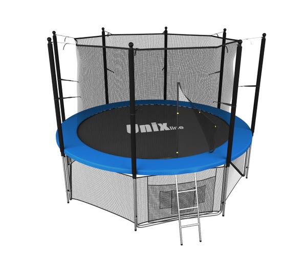 Помимо верхней защитной сетки, все батуты модельного ряда UNIX line оборудованы нижней защитной сеткой, которая препятствует проникновению под прыжковое полотно батута детей, животных, а так же попаданию посторонних предметов, и лестницей для удобства пользования. А в моделях диаметром от 10FT (305см.), в комплект входят специальные крепления батута к земле (колышки).