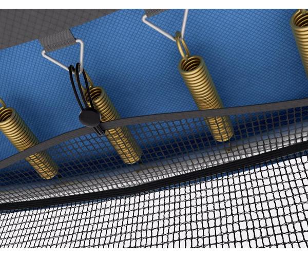 Защитный мат для пружин, расположенный по периметру батута, состоит из четырех слоев, обшитых ПВХ материалом, плотностью 130 г/см3 и надежно закрывает пружины.