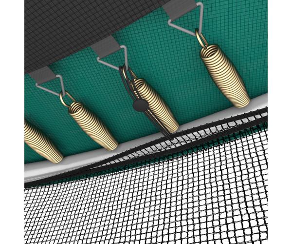 Защитный мат для пружин, расположенный по периметру батута, состоит из четырех слоев, обшитых ПВХ материалом, плотностью 150 г/см3 и надежно закрывает пружины.