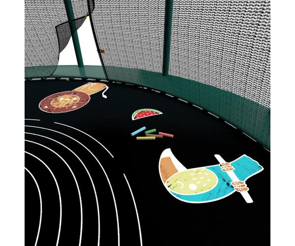 Защитный мат для пружин, расположенный по периметру батута, состоит из четырех слоев, обшитых ПВХ материалом, плотностью 150 г/см3 и надежно закрывает пружины.