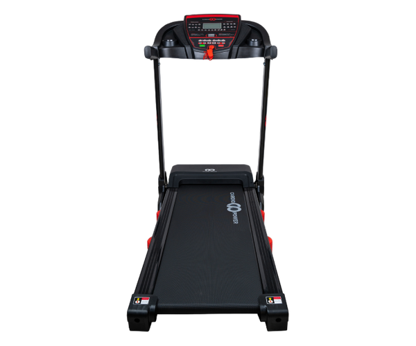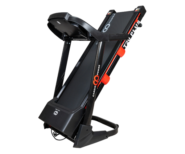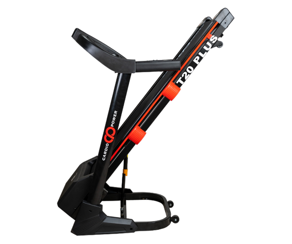 CardioPower T20 Plus оснащен гидравлическим механизмом складывания SmartFold и транспортировочными колесами для удобного перемещения и хранения.