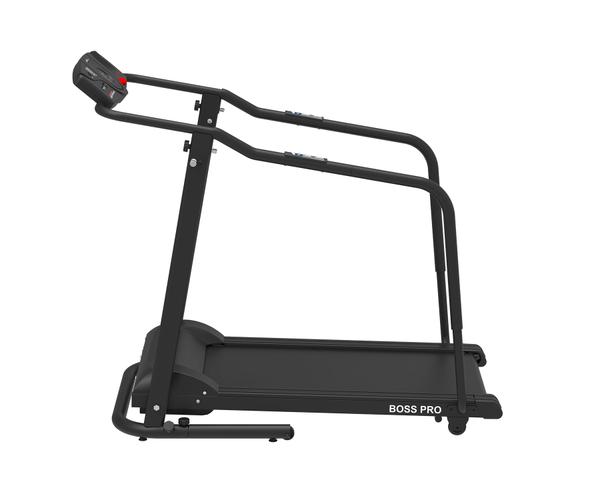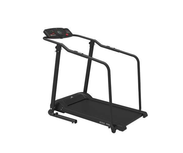 Тренажер из популярной серии беговых дорожек DFC BOSS  - модель PRO. Предназначена для ходьбы, с длинными обрезиненными поручнями на всю длину тренажера.  Рекомендуется реабилитационное использование для восстановления функций опорно-двигательного аппарата.Скорость полотна начинается с 0,6 км/ч и повышается с шагом 0,1 км/ч. Возможен запуск двигателя с пользователем на полотне. Дорожка легко перемещается с помощью транспортировочных роликов. Датчики пульса на поручнях помогут измерить частоту сердечных сокращений.