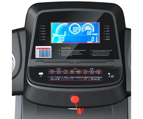 Консоль беговой дорожки оснащена LCD-дисплеем размером 7 дюймов с голубой подсветкой, отображает всю необходимую пользователю информацию во время тренировки: скорость, пройденное расстояние, сжигаемые калории, частоту пульса.
