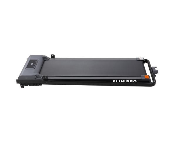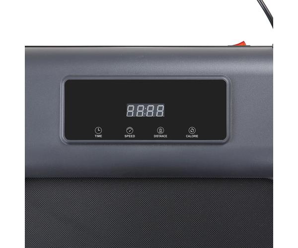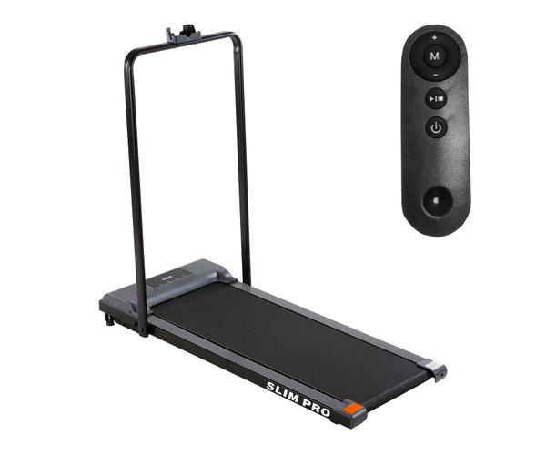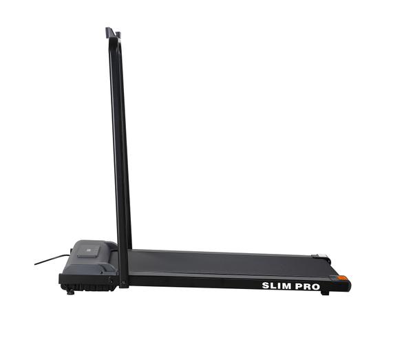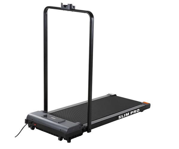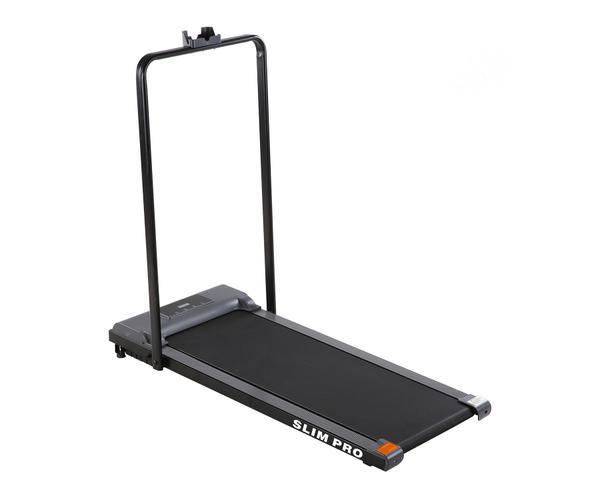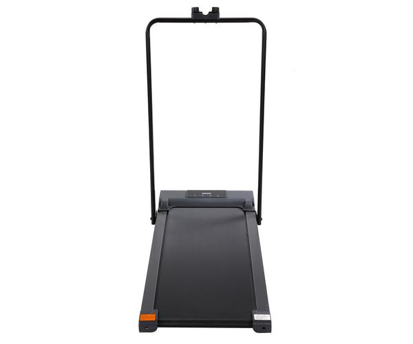 На дорожке установлен удобный складной поручень с держателем под девайс и пульт. После занятий поручень убирается, и тренажер получается очень тонким, всего 12,5 см.