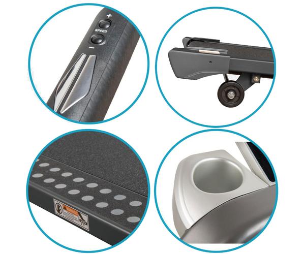 Голубой монохромный LCD дисплей показывает всю необходимую информацию. Сенсорная панель управления очень легка в управлении. Складная конструкция позволит компактно хранить тренажер, а транспортировочные ролики облегчат перемещение беговой дорожки. Для безопасности спортсмена предусмотрены подножки по обе стороны от бегового полотна с антискользящим покрытием.