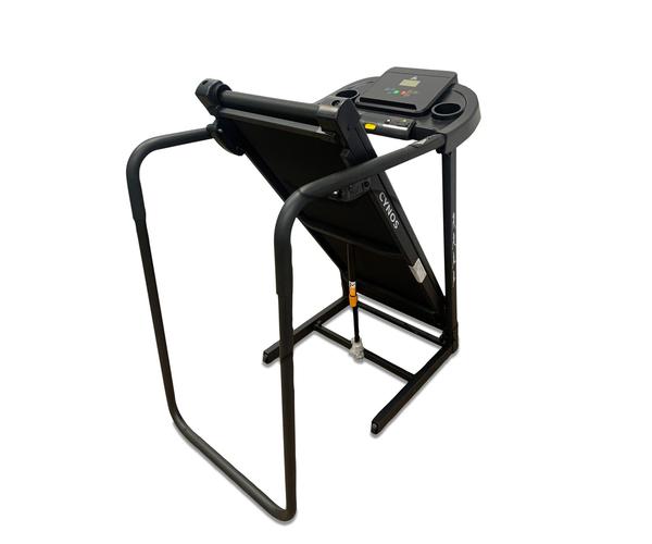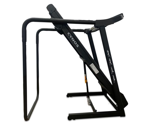 Беговая дорожка CYNOS имеет складную конструкцию. В сложенном виде она занимает минимум места, что удобно для небольших квартир. Есть два варианта хранения: с поручнями или без них. Первый подходит, если нужно регулярное использование дорожки. Во втором случае поручни снимаются для более длительного и компактного хранения (например, в кладовой). Транспортировочные ролики позволяют легко перемещать её при необходимости.