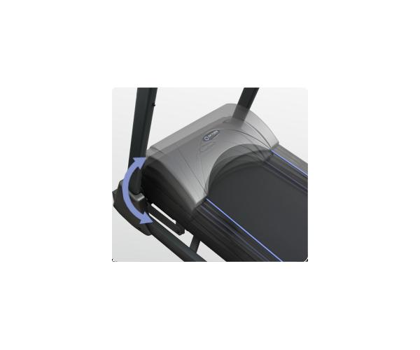 Есть здесь и 2 пульсозависимые программы с предустановленными значениями 65% либо 85% от целевого максимального пульса. Для точного определения пульса и просто комфортной тренировки в компьютер встроен высокоточный беспроводной приемник. К другим особенностям дорожки относятся гидравлическая система складывания easyFOLD™, которая существенно облегчает складывание дорожки, а при раскладывании обеспечивает медленное опускание полотна в последней фазе, гарантируя легкость и безопасность. Перемещение дорожки происходит за счет 2-ух транспортировочных роликов. Выровнять положение тренажера относительно поверхности можно за счет компенсаторов неровностей пола.