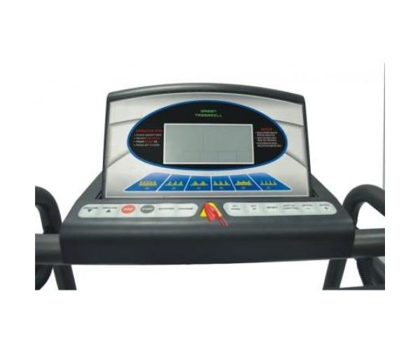 На боковых поручнях справа и слева размещены кнопки экстренной остановки. С их помощью можно быстро остановить тренировку без поиска нужной кнопки Стоп. Также имеется необходимый атрибут любой беговой дорожки – ключ безопасности! Мягкие подлокотники установлены на поручнях, на них можно опереться в перерывах между занятиями. На тренажере установлен LCD-дисплей. На нем отображаются все данные тренировки – время, скорость, расстояние, потраченные калории. Экран консоли может регулироваться – выше-ниже для людей разного роста.