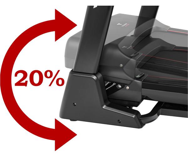 Двигатель японской Fuji Electric мощностью 4,0 л.с. практически не имеет ограничений – максимальный вес пользователя составляет 160 кг. Размер бегового полотна 151 см в длину и 55 см в ширину обеспечивает наиболее комфортный и безопасный режим ходьбы и бега на любых скоростях, включая максимальные. Само беговое полотно толщиной 2,2 мм от производителя наиболее качественных полотен швейцарской компании Habasit™ относится к классу коммерческих и при надлежащем обслуживании пройдет без замены десятки тысяч километров. Мощный двигатель напрямую связан с максимальной скоростью – дорожку можно разогнать до 22 км/ч. Электрический угол наклона регулируется в диапазоне от 0 до 20%, что также является максимально возможным значением.