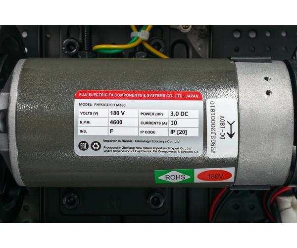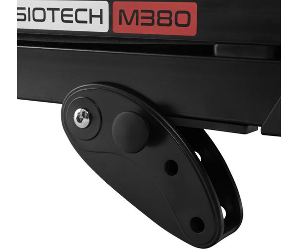 Рама Physiotech M380 построена на перспективной платформе Titanium Compact™ с укороченной базой и вынесением моторного отсека под передний вал беговой дорожки. Длина дорожки в рабочем состоянии при размере беговой зоны 130*47 см составляет всего 144 см, а это существенная экономия места при ее использовании.