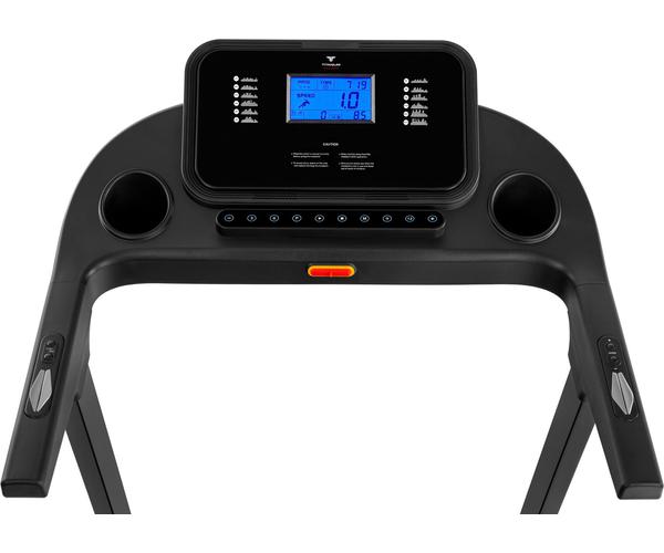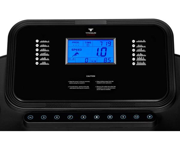 Тренировочный компьютер представлен голубым LCD-дисплеем диагональю 5 дюймов (12,7 см) c сенсорными клавишами. На экран одновременно выводятся все основные параметры тренировки - время, скорость, дистанция, угол наклона, потраченные калории и пульс. В программный пакет входят 15 предустановленных программ, направленных на тренировку скоростных качеств, выносливости, укрепления сердечно-сосудистой системы и похудания, а также 3 программы обратного отсчета (время, дистанция, калории). Для считывания показаний пульса в поручни дорожки вмонтированы контактные сенсорные датчики. Благодаря "быстрым клавишам" управления можно отрегулировать скорость либо угол наклона, не снимая рук с поручней.