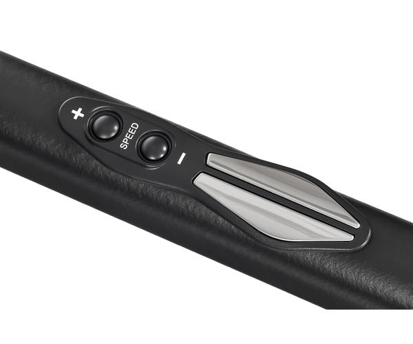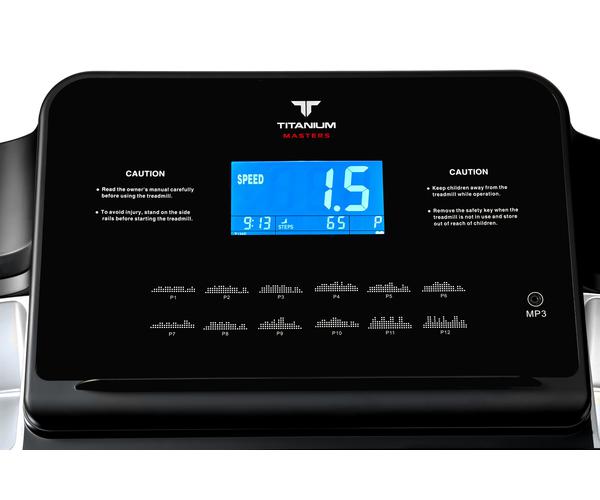 Тренировочный компьютер представлен голубым многофункциональным дисплеем диагональю 5 дюймов (12,7 см). На экран одновременно выводятся все основные параметры тренировки - время, скорость, дистанция, потраченные калории и пульс. В программный пакет входят 12 предустановленных программ, направленных на тренировку скоростных качеств, выносливости и укрепления сердечно-сосудистой системы. Помимо предустановленных программ, можно воспользоваться самостоятельно регулируемым ручным управлением или создать собственную программу в одном из 3-х пользовательских режимов. Здесь также есть 3 пульсозависимых режима. Для считывания показаний пульса в поручни дорожки вмонтированы контактные сенсорные датчики. Благодаря "быстрым клавишам" управления можно отрегулировать скорость либо угол наклона, не снимая рук с поручней. Разнообразить тренировку поможет мультимедийная составляющая - в консоль дорожки установлены колонки мощностью 3 ватта, а носителями аудио файлов выступают MP3-плеер или смартфон. К другим особенностям дорожки относятся двухфазная гидравлическая система складывания easy-DROP™, которая существенно облегчает складывание дорожки, а при раскладывании обеспечивает медленное опускание полотна в последней фазе, гарантируя легкость и безопасность. Перемещение дорожки происходит за счет 2-х транспортировочных роликов.