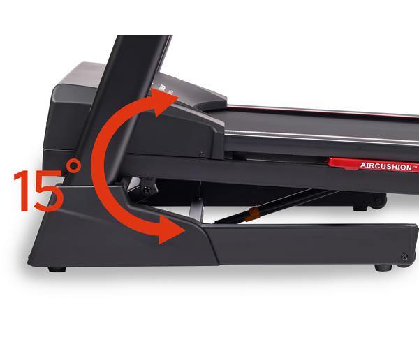 По своих биомеханическим показателям Titanium Masters Physiotech TGF ориентирован на абсолютно любые категории пользователей – от начинающих до профессиональных спортсменов. В моторном отсеке – надежный, проверенный временем двигатель японской Fuji Electric мощностью 3,25 л.с. постоянного тока, он разгоняет дорожку до внушительных 16 км/ч. Размер бегового полотна составляет 138 см. в длину и 46 см. в ширину – это отличные показатели, обеспечивающие безопасность, комфорт и свободу движений на любых скоростях. Электрически изменяемый угол наклона от 0 до 15% усиливает нагрузку и общую эффективность тренировки, особенно в связке с встроенными тренировочными программами. За качество скольжения отвечает многослойное полотно NНT-218 толщиной 1,8 мм. швейцарского бренда Habasit и парафинированная дека толщиной 18 мм. Двухфазная гидравлическая система складывания easy-DROP™ существенно облегчает складывание дорожки, а при раскладывании обеспечивает медленное опускание полотна в последней фазе, гарантируя легкость и безопасность. Перемещение дорожки происходит за счет 2-х транспортировочных роликов.