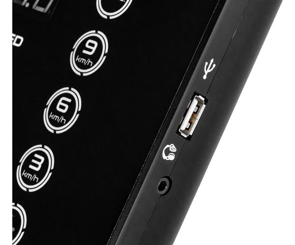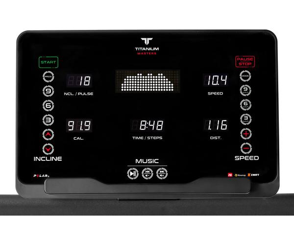 В программный пакет тренировочного компьютера входит масса различных программ. 18 предустановленных программных профилей ориентированы на различные задачи – тренировку выносливости, скорости, кардио, снижение веса и сжигание жира. Если по каким-то причинам ни один из 18 предустановленных профилей не подойдет – можно самостоятельно написать и сохранить в одном из трех слотов собственную программу. 3 пульсозависимые программы отвечают за тренировку тех пользователей, которым важно контролировать показатели частоты сердечного ритма. Для точного определения пульса и просто комфортной тренировки в консоль встроен высокоточный беспроводной телеметрический приемник – оригинальный Polar™ (передатчик сигнала в виде нагрудного ремня приобретается отдельно). Разнообразить тренировку поможет мультимедийная составляющая – в дорожку установлены колонки мощностью 3 ватта, а звук воспроизводится с пользовательского смартфона через Bluetooth. Управлять воспроизведением аудио можно непосредственно клавишами консоли. Сам смартфон можно положить на предназначенную для этого подставку, а также зарядить через консольный USB порт.