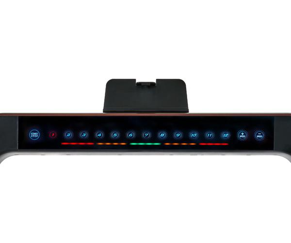 По своим характеристикам Slimtech C10 ориентирована на массовый сегмент пользователей начального и продвинутого уровня. Максимальная скорость составляет 12 км/ч, этого достаточно для большинства пользователей. Размер бегового полотна 112 на 40 см подойдет для комфортной тренировки. Современная система амортизации на основе 4 среднеразмерных эластомеров edge-V™ настроена на средний уровень жесткости.Тренировочный компьютер представлен двумя LED дисплеями – один на консоли, второй на кожухе моторного отсека. Управлением компьютером происходит посредством сенсорных клавиш, пульта дистанционного управления либо через скачиваемое на мобильный телефон приложение EQiSports. В последнем случае приложение добавляет возможность использования программ обратного отсчета (времени, калорий или дистанции), а также контроль зоны частоты сердечных сокращений. К числу передовых решений относится датчик присутствия пользователя. Дорожка остановится и выключится автоматически если тренирующегося нет на беговом полотне. В дорожку установлены колонки мощностью 3 Ватта, подключение мобильного устройства происходит по Bluetooth соединению.