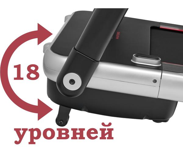 Сердце дорожки – это ее двигатель. В Titanium Masters Slimtech S50 установлен мощный, проверенный временем двигатель Fuji Electric 2.5 л.с. Электромоторы этого производителя отлично зарекомендовали себя в Российской Федерации – они надежны, устойчивы к перепадам напряжения в сети и, кроме того, практически бесшумные. Двигатель, установленный в Slimtech S50, отличается высокой и ровной тяговитостью – поэтому ходьба или бег на этой дорожке будут максимально комфортными. Здесь полностью исключен эффект так называемого проскальзывания, когда беговое полотно начинает замедляться в момент касания стопы. Мотор отлично тянет как на низких скоростях, так и на максимальной для Titanium Masters Slimtech S50 16 км/ч. Это важно не только с точки зрения комфорта, но и безопасности – поскольку положение пользователя на дорожке должно быть максимально устойчивым. Для максимизации эффективности тренировочного процесса можно и нужно использовать электрический угол наклона с 18 уровнями регулировки.