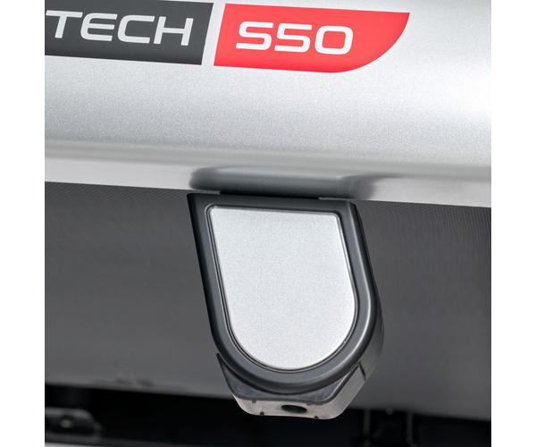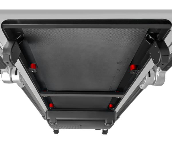 Отдельно стоит сказать про систему складывания. Slimtech S50 складывается за полминуты и транспортируется с помощью транспортировочных роликов в любую точку помещения. Дорожку можно хранить как в горизонтальном, так и вертикальном положении – для этого предусмотрена опора, надежно фиксирующая тренажер.