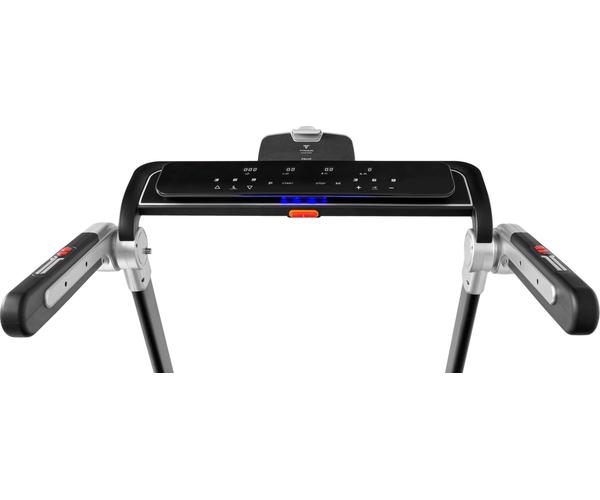 Преимуществом дорожки является также информативная и технологичная консоль с сенсорными клавишами, построенная с использованием 4-х LED дисплеев последнего поколения. Она обладает простым и понятным интерфейсом – в навигации можно разобраться за пару минут даже без знания английского. Сам компьютер, помимо базовых значений (скорость, дистанция, расстояние, сожжённые калории, угол наклона и пройденные шаги), включает в себя 14 предустановленных программ, каждая из которых специализируется на своей задаче – снижении веса, сжигании жира, развитии выносливости, кардио и т.д. Пульс можно контролировать с помощью одной из трех пульсозависимых программ – для этого в поручни встроены сенсорные датчики пульса. Впрочем, для получения точных значений и просто удобства лучше опционально приобрести нагрудный телеметрический ремень, благо в консоль встроен беспроводной приемник пульса (оригинальный Polar). 3 пользовательские программы дают возможность создать и в дальнейшем использовать собственные тренировочные профили. Также здесь есть 3 программы обратного отсчета калорий, дистанции или времени.