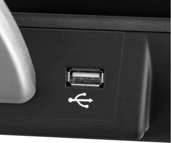Мультимедийные динамики мощностью 3 Ватта воспроизводят качественный звук с подключаемого мобильного устройства. В передней части консоли расположена подставка под смартфон или планшет, причем зарядить устройство можно прямо на месте через USB порт.