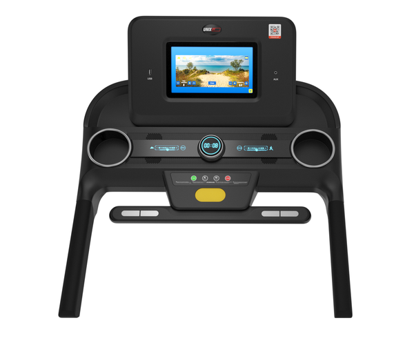 У дорожки имеется интуитивно понятная консоль управления с цветным TFT-дисплеем размером 10,1" (25 см). По центру консоли располагается кнопка включения и остановки тренировки. Движением кнопки по и против часовой стрелки можно изменить скорость движения бегового полотна, и так же на дополнительном дисплее отследить данные о тренировке. По обе стороны от кнопки встроенные ползунки изменения скорости и угла наклона.