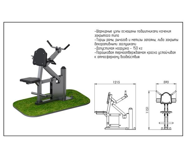 • Упоры для ног из круглой трубы диаметром 42,3 мм, хваты для рук -рычаги из трубы диаметром 26,8 мм, оснащены резиновыми наконечниками