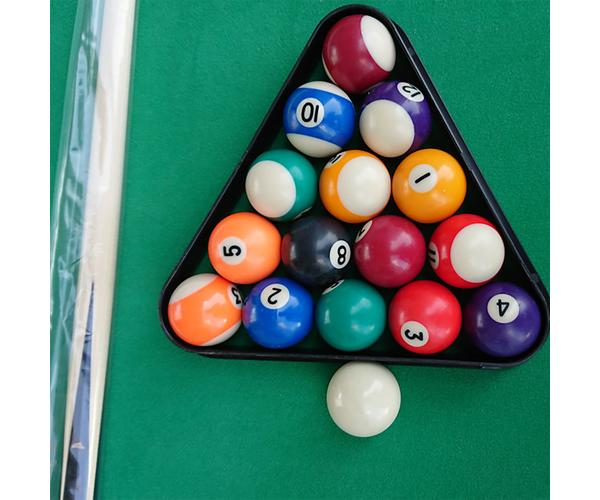 В комплекте все необходимые акссесуары: 2 кия, набор шаров для пула, треугольник, щетка, 2 мела.