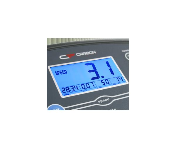 Все показатели тренировки выводятся на многофункциональный голубой дисплей высокой контрастности размером 4.9 дюйма (12.5 см.). Программный пакет состоит из 15 предустановленных программ различного назначения, а также самостоятельно регулируемый ручной режим. Помимо этого, можно создать собственную программу в одном из 3-ех пользовательских режимов или обратиться к пульсозависимым программам. Для комфорта и эффективности тренировки имеется функция беспроводного определения частоты сердечного ритма (приемник сигнала уже встроен в консоль, а нагрудный ремень-передатчик приобретается отдельно). Пульсозависимая тренировка длится не менее 20 минут.