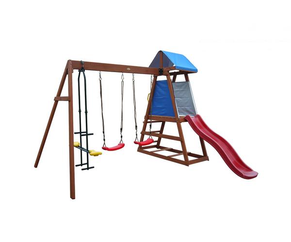 В комплект городка входит: деревянный игровой домик с крышей (башня); горка волнистая; качели двойные; качели одиночные 2 шт.