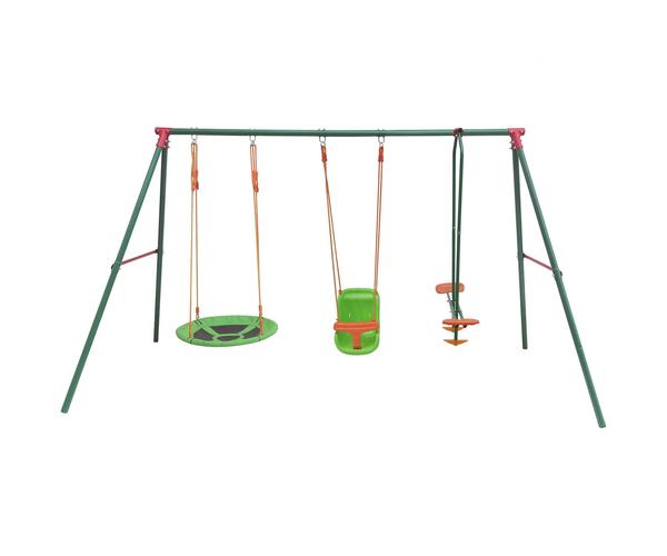 Комплекс включает в себя: двухместные качели, качели - гнездо и качели для малышей.