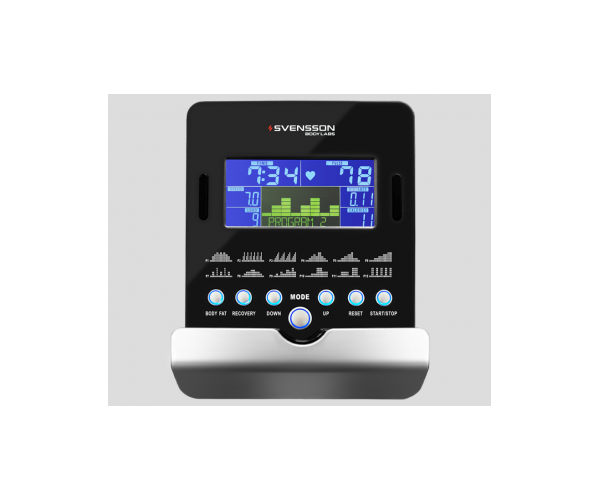SVENSSON BODY LABS STRIDELINE EXA имеет в своем арсенале мощный тренировочный компьютер. Консоль нацелена на достижение спортивных задач, как любителей, так и опытных пользователей. Цветной дисплей на основе жидких кристаллов (он же LCD) диагональю 14 см отображает все ключевые показатели: время, дистанция, скорость, калории, обороты в минуту и пульс. Пользователи смогут воспользоваться пакетом из 12 предустановленных профилей, направленных на развитие скоростных качеств, выносливости, укрепления сердечно-сосудистой системы, сжигания жира и похудения. Для тренировок с контролем пульса запрограммировано 4 пульсозависимых программы (55%, 75%, 90% и целевая). Кроме того, здесь есть полностью регулируемая пользовательская программа, Ватт-программа и ручной режим. По завершении тренировки функция Recovery оценит способность сердечно-сосудистой системы к восстановлению. Жироанализатор (Body Fat) предоставит дополнительную информацию o состоянии организма.