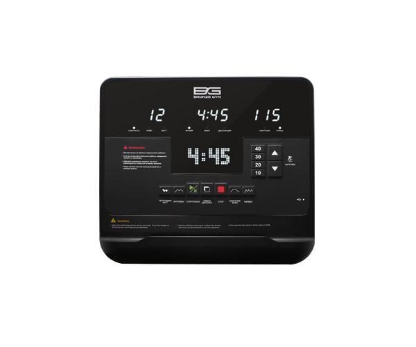 Бортовой компьютер на Bronze Gym XE1200M представлен многофункциональным матричным LED-дисплеем диагональю 15,6 дюймов. Основной экран дополняют 3 небольших буквенно-цифровых LED-дисплея. На мониторах отображаются следующие данные: время, скорость, дистанция, уровень нагрузки, расход калорий, пульс, темп, Ватт. Все клавиши и дисплеи оснащены белой подсветкой, а надписи русифицированы. В число тренировочных режимов входит кардиотренировка, Ватт-программа и программа сжигания жира. Помимо предустановленных программ, можно воспользоваться самостоятельно регулируемым ручным режимом.
