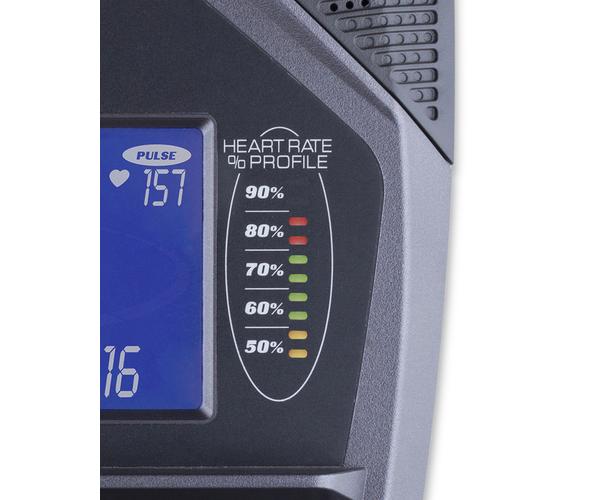6. Функция Heart Rate%Profile предоставляет возможность мгновенного контроля пульса. На экран выводится процентное соотношение текущего пульса к максимальному для данного пользователя. Светодиоды загораются разными цветами в зависимости от уровня. Желтый - 50-60%, зеленый - 65-80%, красный свыше 85%.  Эта функция позволяет в реальном времени отслеживать Ваши показатели.