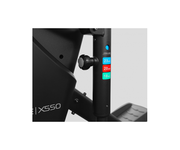 К числу других преимуществ BASE X550 относится сбалансированный маховик с инерционным весом 25 кг и механически изменяемая длина шага. Она регулируется в одном из 3 положений и может быть выставлена на 18 дюймов (46 см), 20 дюймов (51 см) или 23 дюйма (58 см). За счет переднего привода обеспечивается минимальное расстояние между педалями (супермалый Q-фактор E.S.Q.F.) - 9 см. Максимальный вес пользователя - 160 кг.