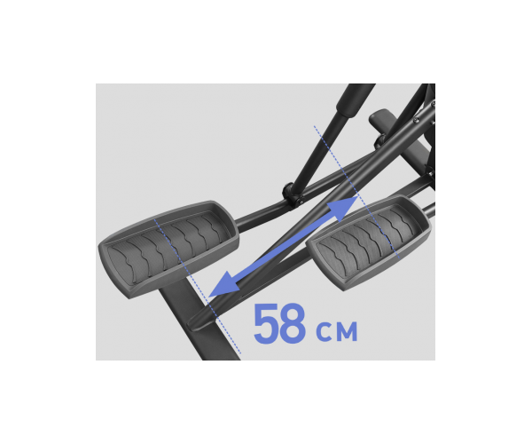 Длина шага является одним из самых важных параметров при выборе эллиптического тренажера. При упрощенном подходе длина шага от 30 до 40 см считается минимально допустимой, от 40 до 50 см - средней комфортабельной, а все, что выше 50 см - это уже премиальный уровень. Для BASE X550 этот показатель варьируется от 46 см до 58 см. Максимальная длина шага 58 см - это очень хороший показатель не только для полупрофессиональных, но и профессиональных моделей.