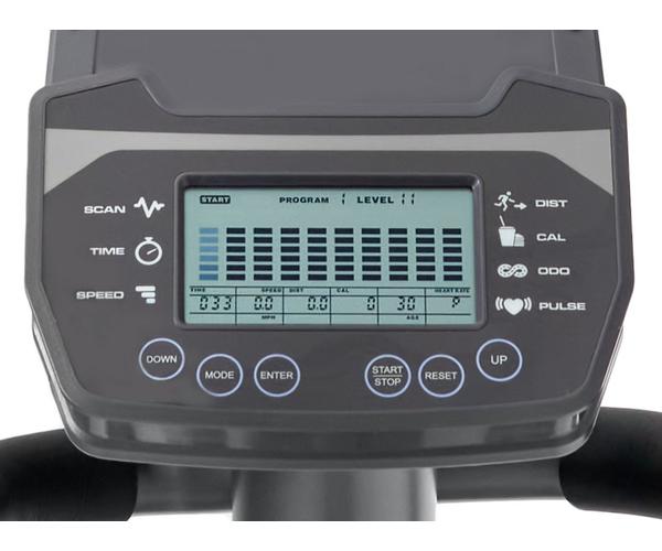 • Показания консоли: программный профиль, уровни нагрузки, время, дистанция, скорость, калории, обороты в мин., пульс, ватты
