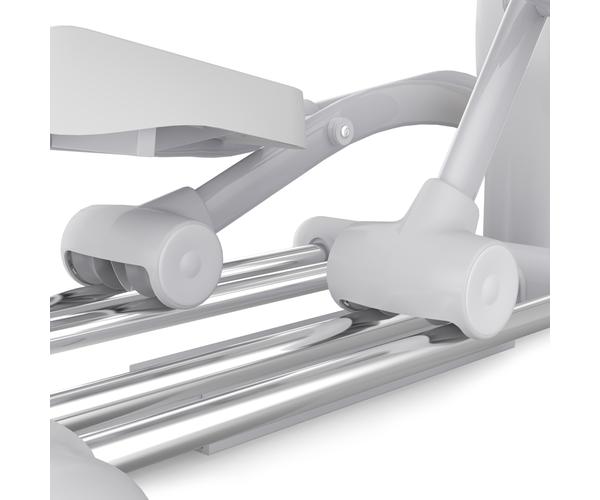 Тренажер с автоматической регулировкой рамы в 3 положениях оборудован эргономичными поручнями с датчиками пульса и противоскользящими широкими педалями с мягкими вставками, и оптимальной длиной шага 52 см, которые обеспечивают удобную и безопасную тренировку. Это позволяет задействовать большое количество мышечных групп - от бедер до ягодиц. Эллиптический тренажер может выдержать человека весом до 150 килограммов.