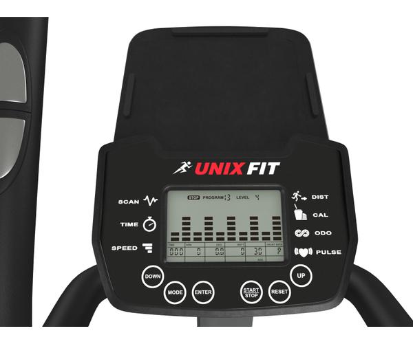 Увеличенный вес маховика позволяет наиболее точно выбрать необходимую нагрузку, сохраняя плавность хода педалей. Электромагнитный эллиптический тренажер UNIXFIT SL-430 обладает усиленным трехкомпонентным педальным узлом и мощной рамой. Длина шага данной модели составляет 43 сантиметра, а расстояние между педалями (Q фактор) составляет всего 19 сантиметров. Электронная система распределения усилия (16 уровней нагрузки), а так же маховик с инерционным весом 14,8 килограмм дают возможность пользователю выбрать оптимальную нагрузку для результативной тренировки. Компьютер эллиптического тренажера UNIXFIT SL-430 имеет 13 предустановленных программ тренировки и ручной режим.