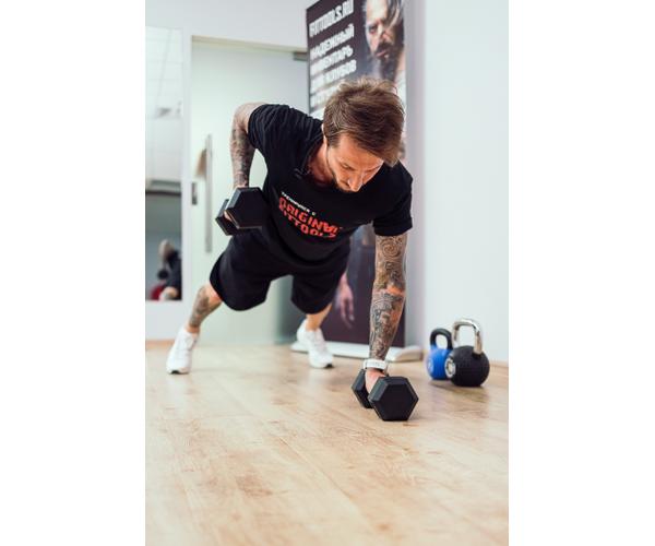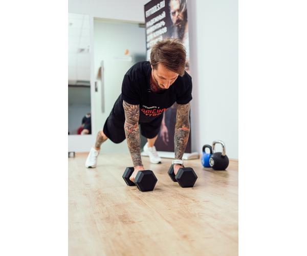 Дизайн гантели, форма весов позволяет использовать пару гексагональных гантелей в качестве упоров для отжиманий.