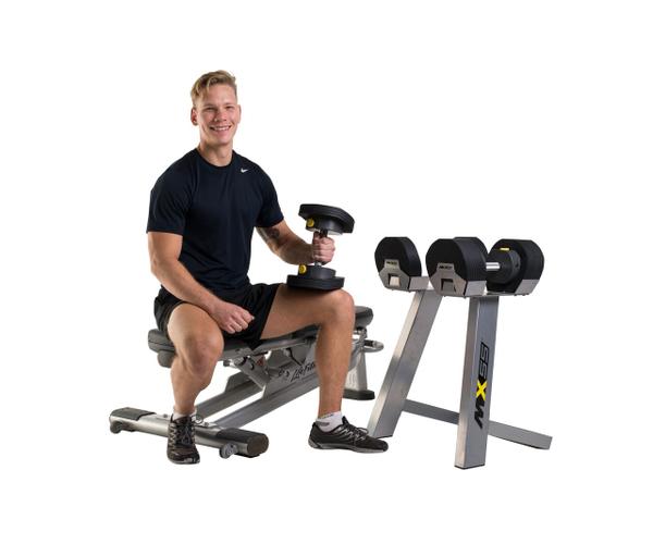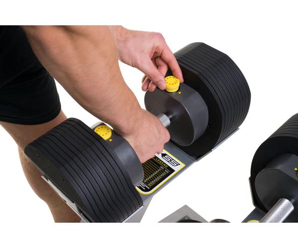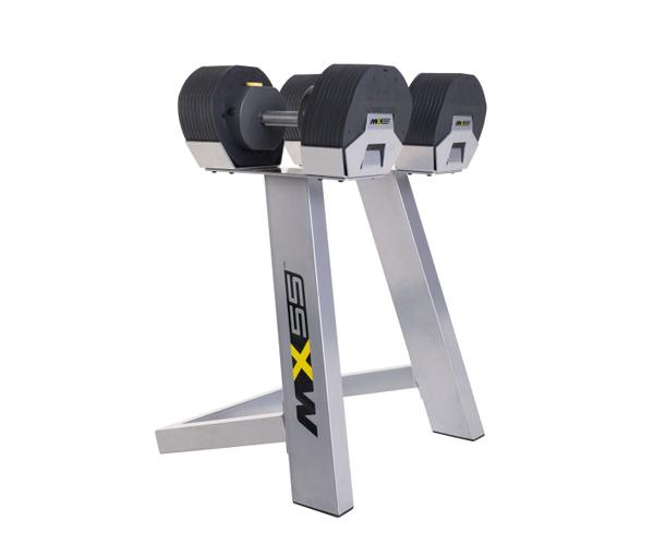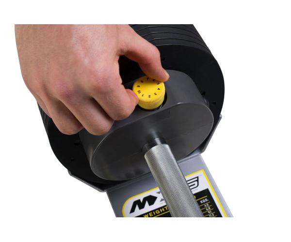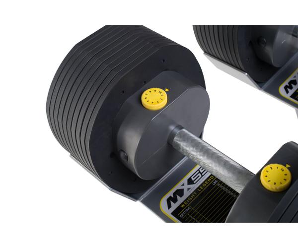 Наборные гантели MX Select MX-55 компактны, имеют стильный дизайн, а инновационный запатентованный механизм позволяет выбрать вес от 4,5 кг до 24,9 кг. Вес 1 шага - 2,25 кг.