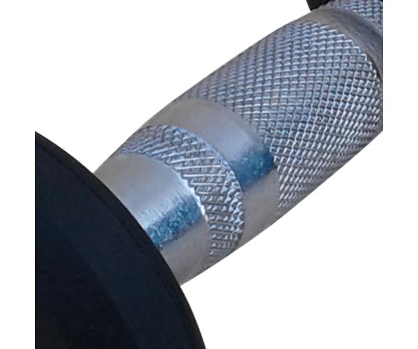 Гантель с грифом из хромированной стали и обрезиненными грузами. Ручка имеет насечки в средней части для предотвращения скольжения рук во время занятий.