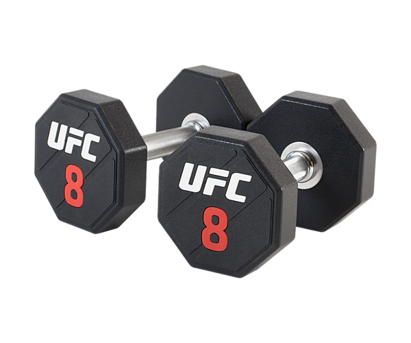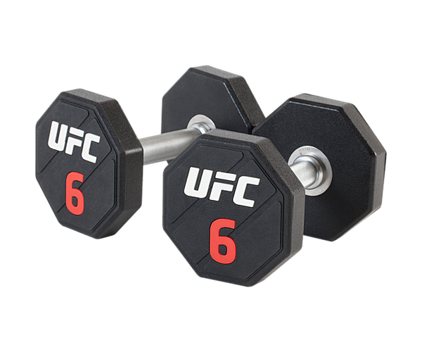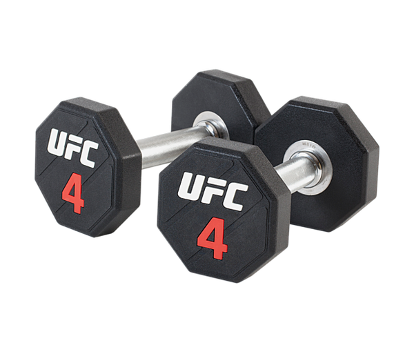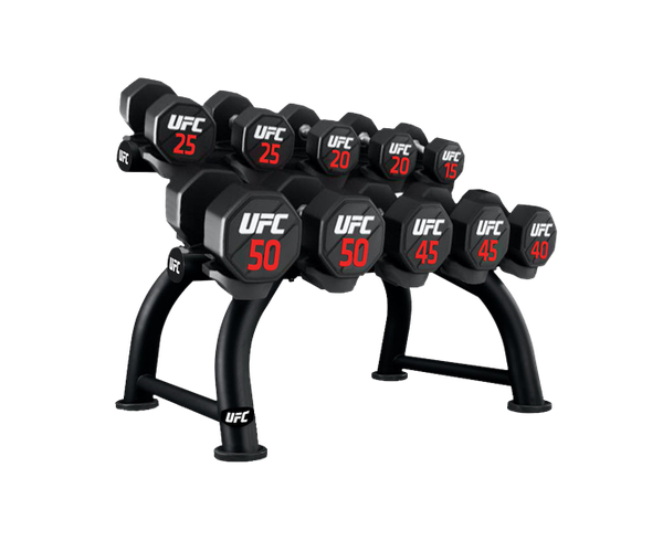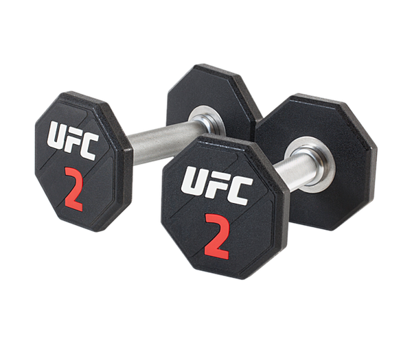 Гантельный ряд UFC представляет собой набор из 5-ти пар уретановых гантелей весом от 32 до 40 кг.