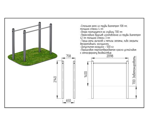 • Перекладины брусьев изготовлены из трубы диаметром 42 м, толщина 3 мм, стягиваются при помощи винтов