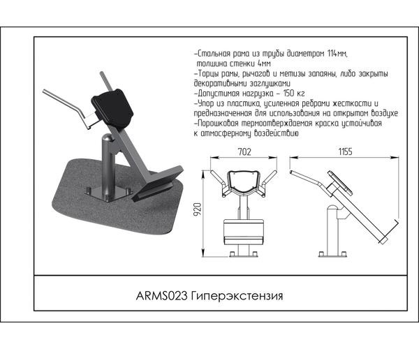 Гиперэкстензия ARMS 023  предназначена для проработки мышц-выпрямителей спины, способствует укреплению ягодиц и сгибателей бедра. Занятия на таком тренажере не оказывают большой нагрузки на суставы, повышают мышечный тонус, увеличивают гибкость, улучшают кровообращение.