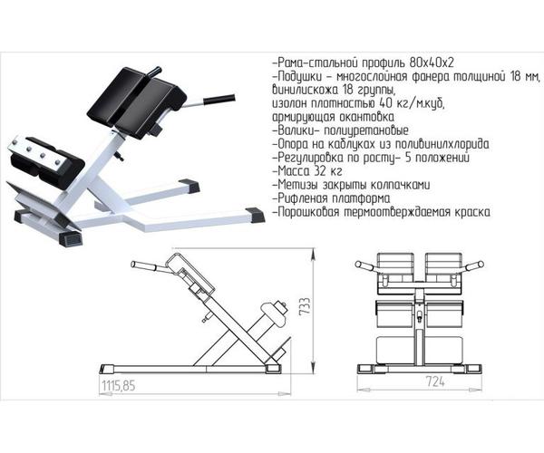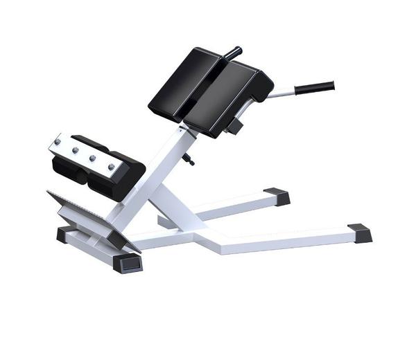Гиперэкстензия наклонная предназначена для тренировки мышц нижней части спины. Нагрузка создается за счет собственного веса атлета. Угол наклона Гиперэкстензии наклонной 45 градусов, упоры регулируются по росту и имеют 5 положений регулировки, мягкие валики надежно фиксируют ноги при выполнении упражнений. Устойчивая  конструкция Гиперэкстензии наклонной дает возможность проводить занятия со спортсменами любого уровня. Для устранения скольжения и увеличения устойчивости тренажер имеет резиновые подпятники.